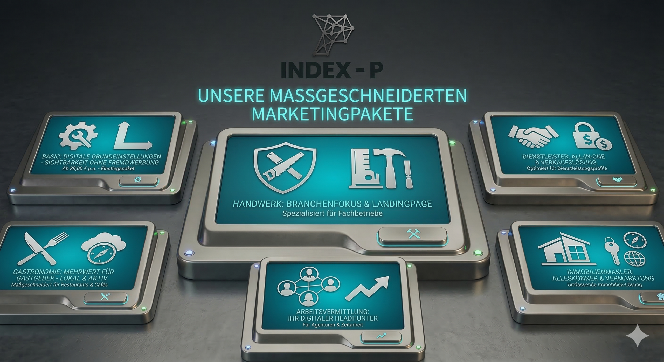 Viele Anbieter locken mit „kostenlosen“ Einträgen, nur um Ihnen später teure Upgrades zu verkaufen. Wir bei Index-P spielen mit offenen Karten: Echte digitale Sichtbarkeit erfordert Expertise und Leistung. Deshalb bieten wir Ihnen Profi-Marketing bereits ab 89,00 € p.a. an.